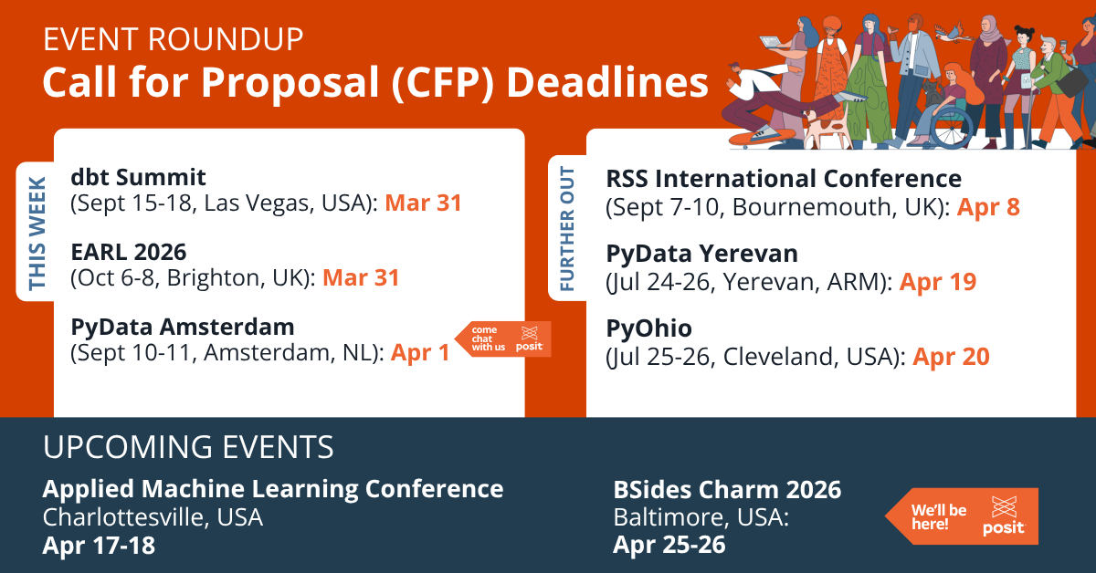 Happy Monday! ☕️ Here’s our weekly roundup of upcoming CFPs and events for #Rstats, #Python, and #OpenSource.